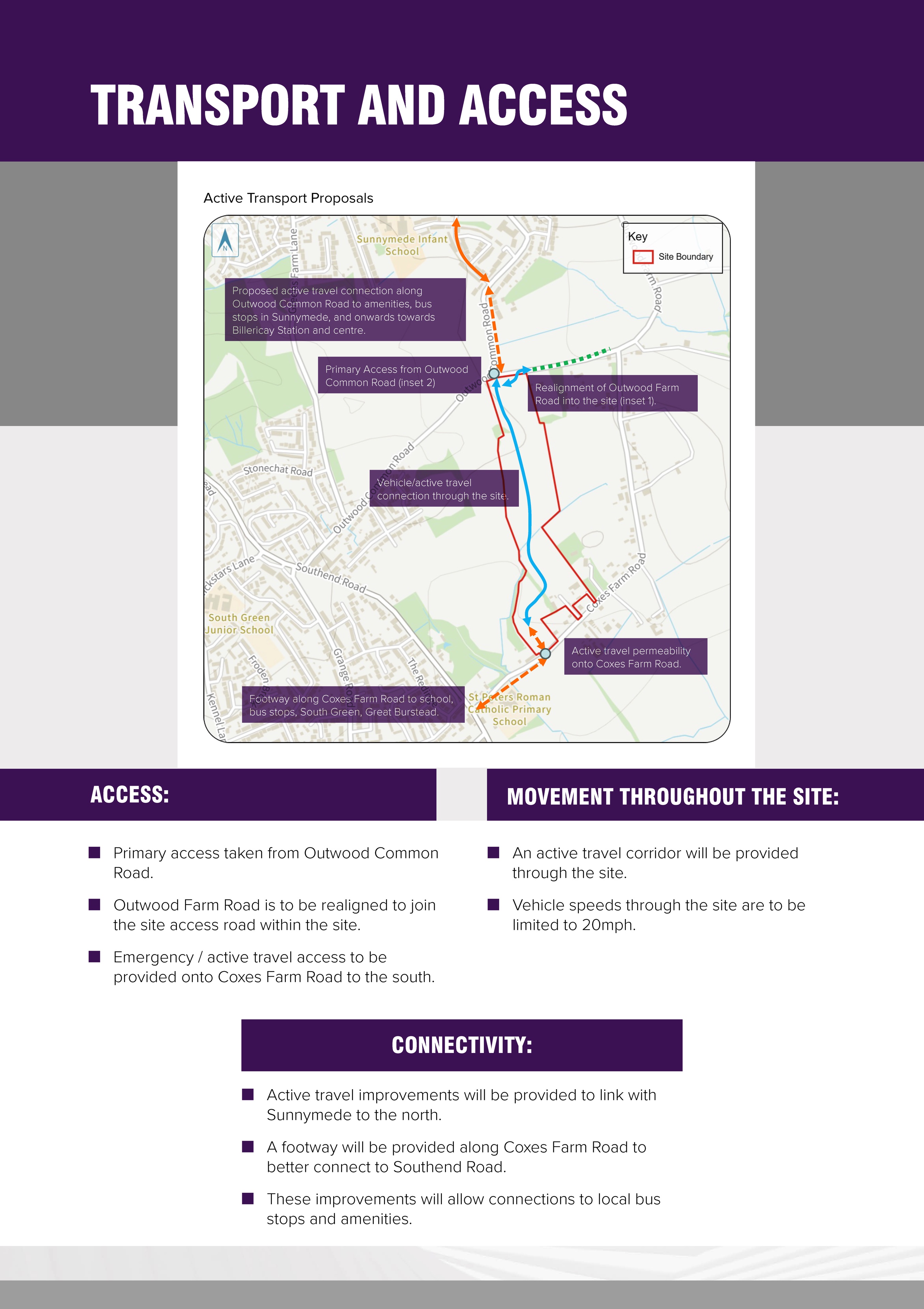 BC Land has carefully considered this and will ensure that the main access point is via Outwood Common Road. There will only be emergency, pedestrian, and cycle access to the south, supporting permeability through the site while prioritising pedestrian and cyclist safety.